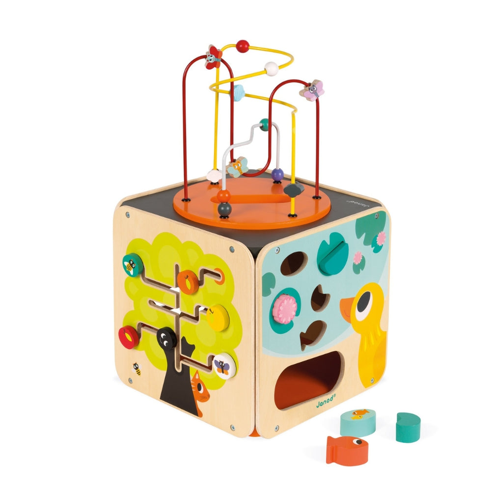 The Multi Activity Cube is vibrantly coloured and has loads of surprises to discover! Each side has a different style of play. Move the leaves, butterfly and bee around the tree maze to develop dexterity or spin the shapes in the egg to see how they fall. Use the mirror to check your look or perhaps you could turn the hen's dial to hear the clicking - or rather, clucking - sound! The caterpillars body parts can be flipped over and there is a 3-wheel cog system to learn cause and effect. The 5 piece shape sorter assists in the learning of shapes and colours with a handy slot to reach in and retrieve your pieces and the looping toy on top helps to develop concentration and motor skills. Turn the looper upside down when you're finished for the day to assist in neat and easy storage. Keep the littlies occupied and let them learn all at the same time