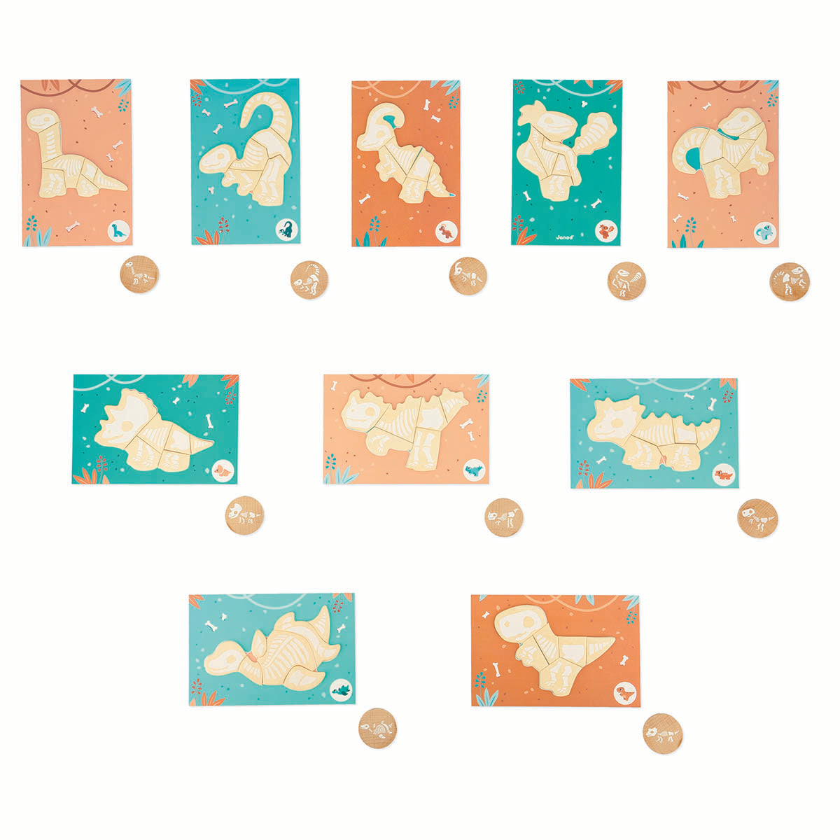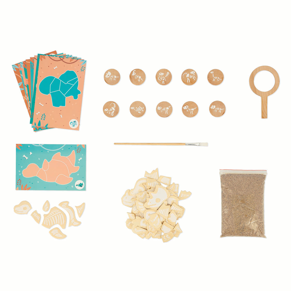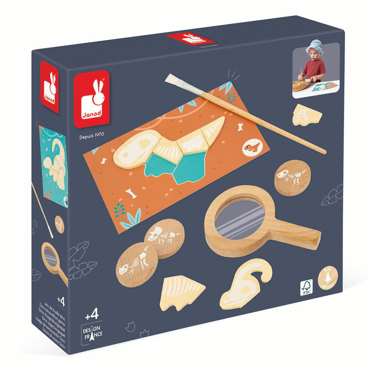 Who does this bone belong to? Your child becomes a real palaeontologist with this Janod Dino Dig game. The object of the game is to reconstruct the different dinosaur skeletons by reassigning their bones. What better way to be fully equipped than with a magnifying glass and a brush? This set also includes 10 dinosaur cards, 64 wooden bones, and 10 wooden clues. To add another dimension to the game just add the included sand to hide the bones. The digging can start and last for hours and is ideal for developing concentration and memory. This Dino Dig Game is made from FSC wood and cardboard and ideal for children 4 and over.