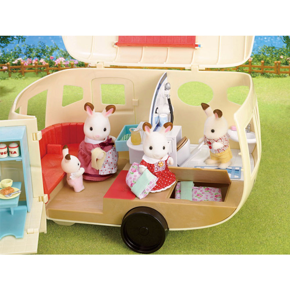 The Sylvanian Caravan has everything needed for staying away from home.Families can create a cosy home away from home with this versatile accommodation.Open up the roof and side to reveal a very well equipped kitchen area with sink, stove, drawers, cupboards and even a fold-out ironing board. Theres a seating area which converts into a double bed and coffee table. There are 2 further fold-out bunks on board. Towards the rear theres a shower room with fold-down loo and a wash-handbasin.Comes with over 35accessories.