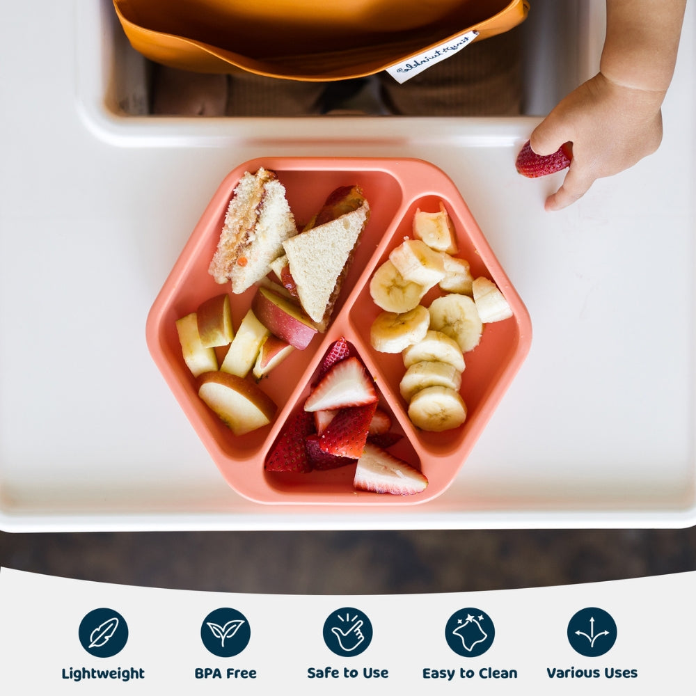 Divided sections for toddler portions, section 1 = 3.72oz (110ml), section 2 = 6.35oz (188ml), section 3 = 9.47 oz (280ml)