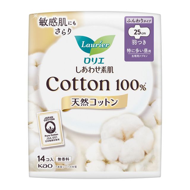 Laurier's instant absorption. Soft even on delicate skin. Pure cotton absorbs even sweat, leaving your skin feeling smooth.