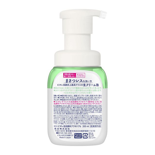 A friction-free wash method without touching the skin with your hands. Biore's best-ever facial cleanser contains plenty of fresh cream foam to absorb and remove dirt. Contains antibacterial and anti-inflammatory agents to prevent acne. After rinsing, your skin will feel refreshed and smooth. Quasi-drug. ● Washes while protecting the skin's barrier function to maintain moisture. ● Non-comedogenic tested (This does not mean that everyone will not develop comedones (acne).) ● Refreshing green soap scent