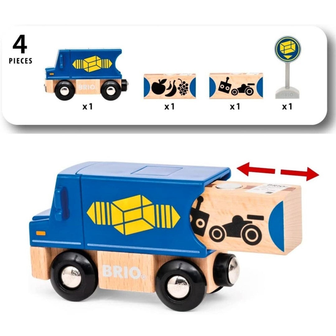Beep beep! There’s a package for you on board the Delivery Truck. Stop at the marked delivery spot and unload the wooden goods from the back of the blue toy truck. Then drive to the next delivery, load it up and lock it into position with the help of magnets. It’s a busy day for the BRIO World delivery services so let’s get moving.