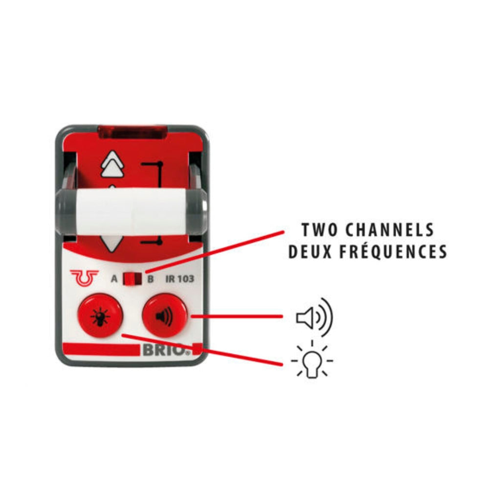 The unique controller has easy to use reverse and stop functions as well as two different forward speeds as well as A&B frequencies to allow for multiple RC trains on the same layout. Press the buttons for light and sound effects. Train is controllable also with buttons on engine.