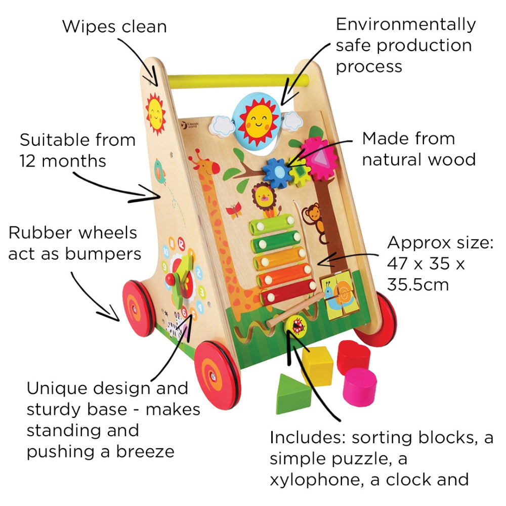 This learning walker has a sturdy base and a unique design that makes standing and pushing a breeze. Includes sorting blocks, a simple puzzle, a xylophone, a clock and cogs. It’s perfect for children aged 12 months and above, to help development and build confidence.