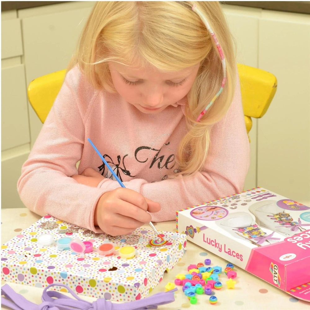 Contents: 6 blank charms to paint, 15 star beads, 15 pony beads, 10 striped beads, 1 pair of lilac shoelaces, 5 paints, paintbrush and guide