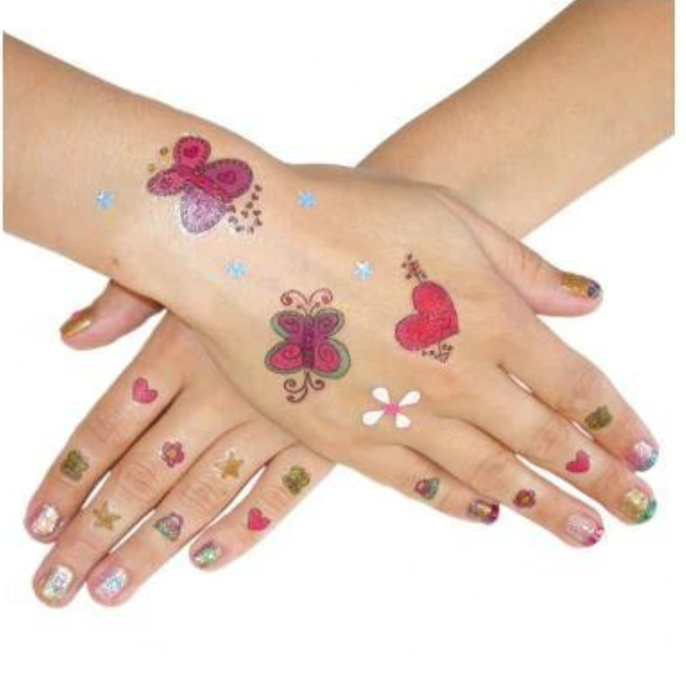 Paint your nails with a coloured nail varnish then add gems, glitter nail varnish or holographic strips. With tattoos for your hands and fingers. Contents: 5 coloured nail varnishes, 2 glitter nail varnishes, nail gems, holographic strips, tattoos and star shaped emery board.