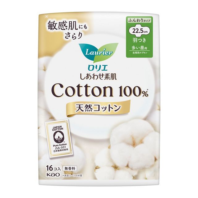 Laurier's instant absorption. Soft even on delicate skin. Pure cotton absorbs even sweat, leaving your skin feeling smooth.