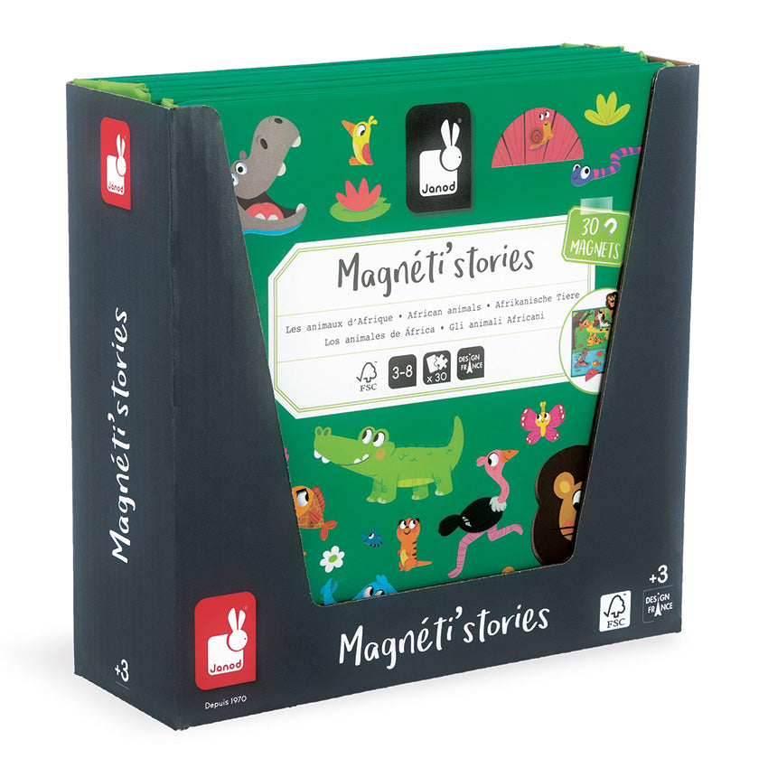 A wild adventure is within easy reach! A lion, elephant, monkey, meerkat and even a piranha are all patiently awaiting new adventures. This folding magnetic story board, designed specifically for children aged 3 years and up, effectively promotes creativity by enabling children to invent wonderful adventures in an African reserve. Made of 30 magnets and an illustrated board in shimmering colours it measures 18cm x 18cm once folded, so can be taken everywhere. Made from FSC certified cardboard and just one of the Magnetic Stories available in the large collection, effectively promoting imagination and motor skills.
