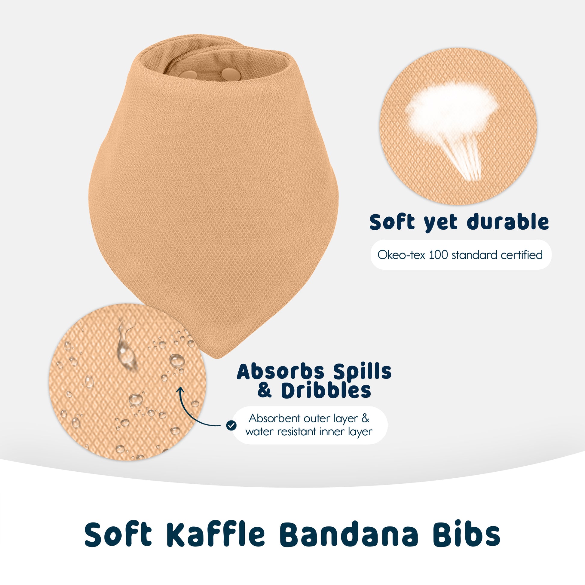 This set features ten soft, absorbent and water-repellent, bandana-style drool bibs. Soak up drool without soaking through! Our luxurious, silky-soft, breathable Kaffle weave fabric is combined with a waterproof inner layer to provide lightweight comfort and fashionable clothing protection. Easy to use snaps closure allows for an adjustable fit.