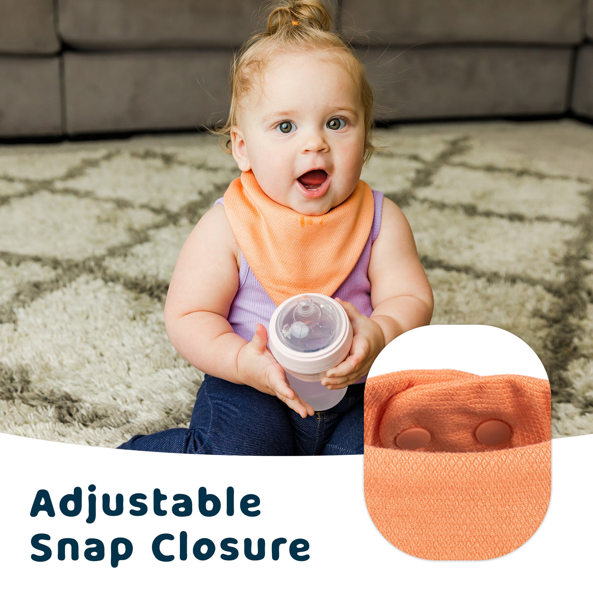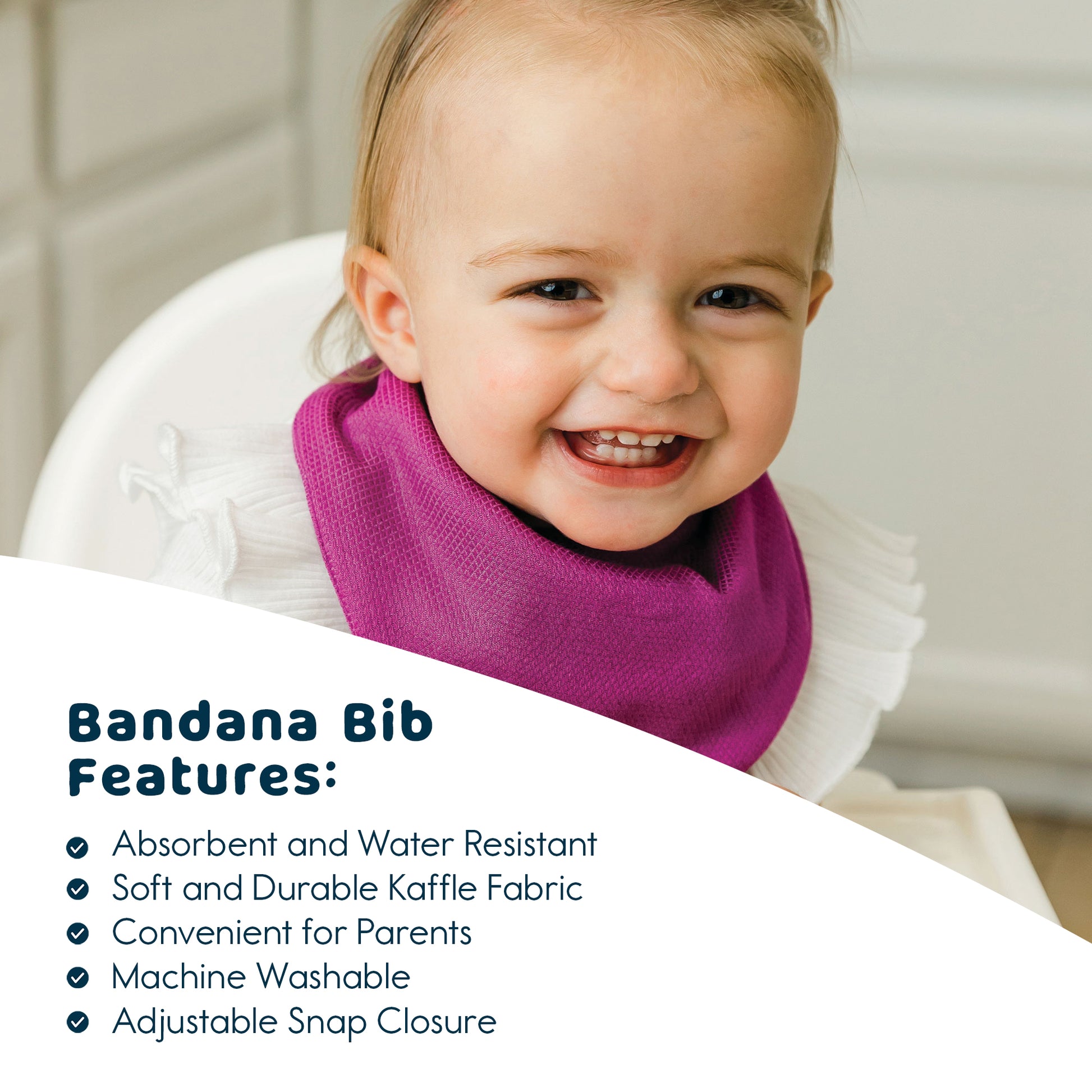 This set features four soft, absorbent and water repellent, bandana-style drool bibs. Soak up drool without soaking through! Our luxurious, silky-soft, breathable Kaffle weave fabric is combined with a waterproof inner layer to provide lightweight comfort and fashionable clothing protection. Easy to use snaps closure allows for an adjustable fit.