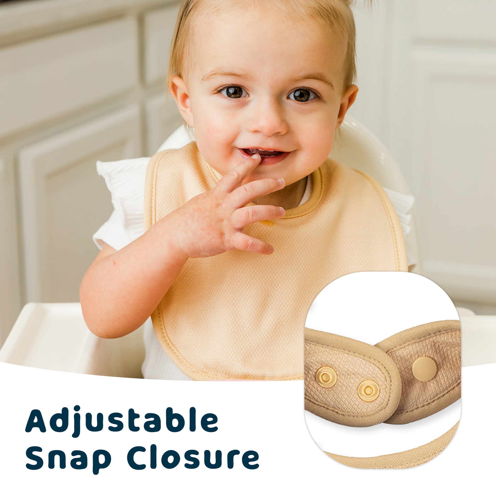 A five piece set ofabsorbent and water repellent bibs that soak up messes without soaking through!Spills are caught and prevented from reaching clothes or baby. Our luxurious, silky-soft Kaffle weave fabric surrounds both an absorbent fleece and a waterproof inner layer. Easy to use snaps closure allows for an adjustable fit.
