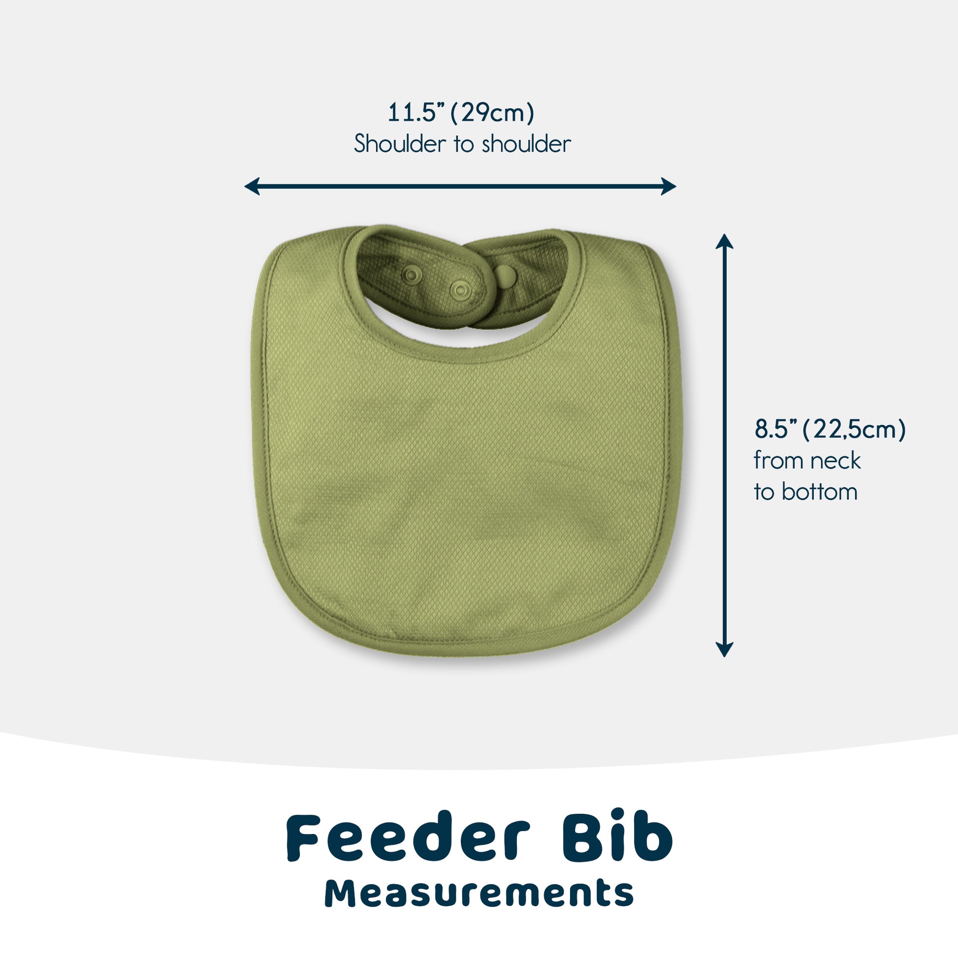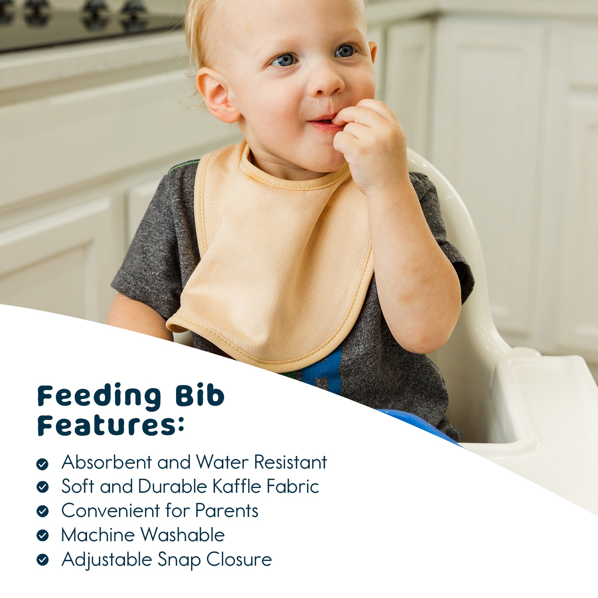 A five piece set ofabsorbent and water repellent bibs that soak up messes without soaking through!Spills are caught and prevented from reaching clothes or baby. Our luxurious, silky-soft Kaffle weave fabric surrounds both an absorbent fleece and a waterproof inner layer. Easy to use snaps closure allows for an adjustable fit.