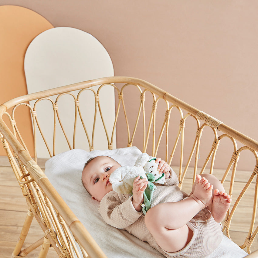 The puppy decorated print on this lovable doudou will become baby's favourite companion. With its small fluffy fur body, this dog doudou is easy to grasp and hold by its body, its big ears or attached blanket. The micro-velvet square blanket sits snuggled between his hands and measures 18cm x 18 cm Particular care has been taken in selecting 95% recycled materials and stuffing. Presented in a beautiful gift box, its the perfect comforter for a gift. Machine washable at 30 degrees and suitable from birth.