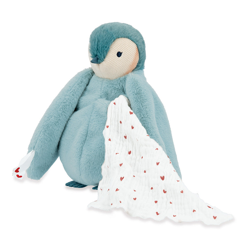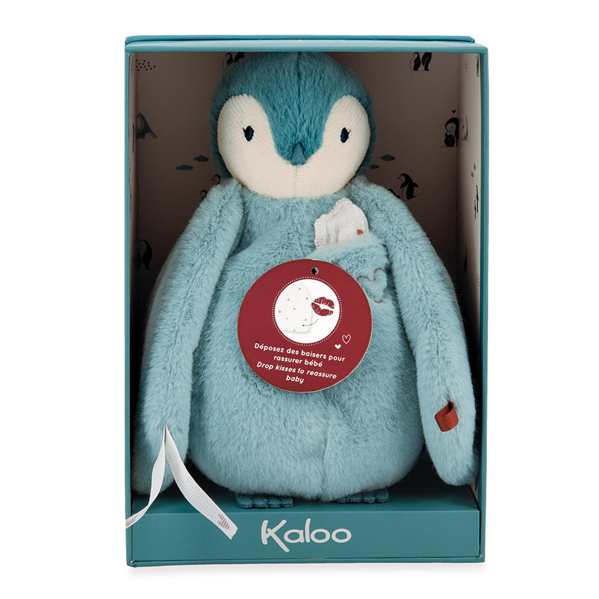 This soft, green penguin, is designed to comfort the baby during moments of separation. Made of extra soft fur, it has a pocket on its heart that contains a long muslin cotton handkerchief to absorb the scent of the parents or to place kisses. They can keep the plush close to them so that it retains their scent and can envelop the baby in a wave of comfort when they hold it. The penguin's wings are tied together with ribbons adorned with a lovely heart, symbolizing protection and attachment. Standing at 20cm heigh It comes in a beautiful and customisable gift box which can be reused as a storage case. Machine washable at 30 degrees. Filled with recycled polyester.