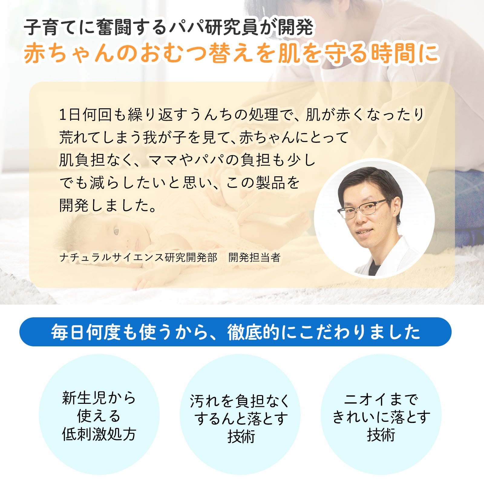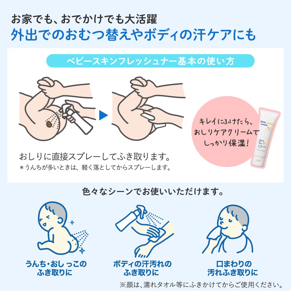 可直接喷在宝宝臀部,再用护臀湿巾擦拭,轻松去除大便、尿液等造成异味和污渍,无需用力搓擦。