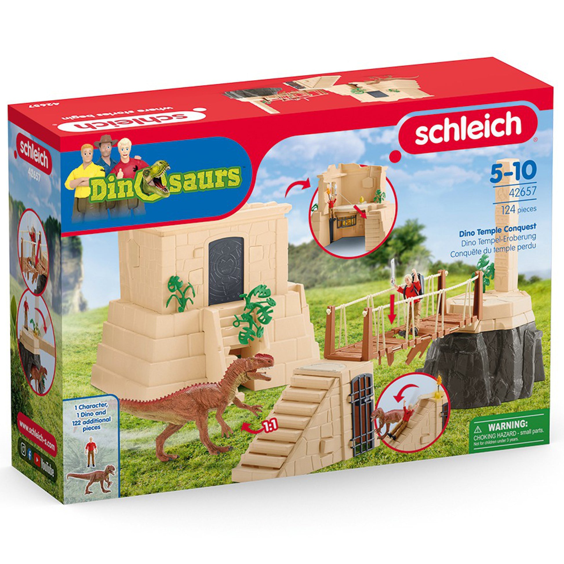 Embark on an epic adventure with the Schleich Dino Temple Conquest playset! Join Flynn as he searches for hidden treasure in a temple full of mysteries. The path to the temple can be reassembled differently each time, keeping the adventure fresh and exciting. Solve puzzles to find key parts that unlock the temple door, but watch out—the steps might turn into a slide! The set includes a fierce dinosaur with a moveable jaw and Flynn with poseable arms, ready for action-packed fun. Will you help Flynn discover the treasure? The adventure is in your hands!