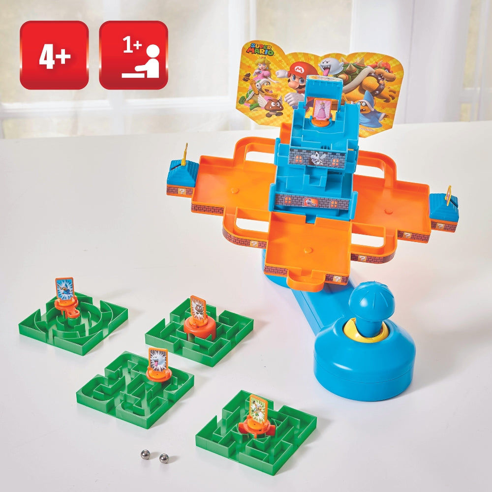 Tilt and turn your way to the top of the castle using the joystick to reunite with Princess Peach. This tabletop action game is fun to play alone, or take turns with others to see who's the fastest! For more fun, replace the targets with figures you've collected from other Epoch Games Super Mario toys and family board games!