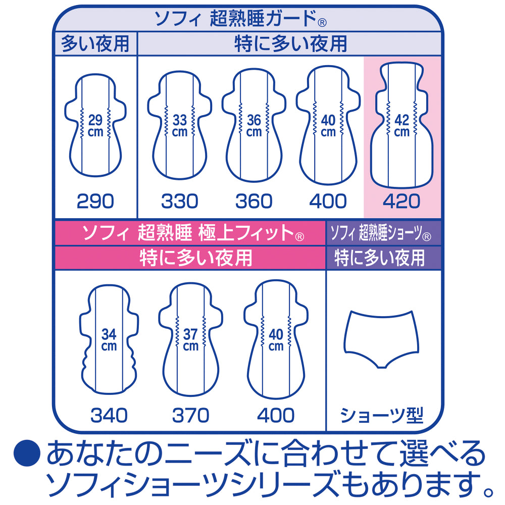 “Sofy Ultra Overnight Guard Wide 420” is a sanitary pad designed for nighttime use, allowing you to sleep soundly all night long even on very heavy flow days.